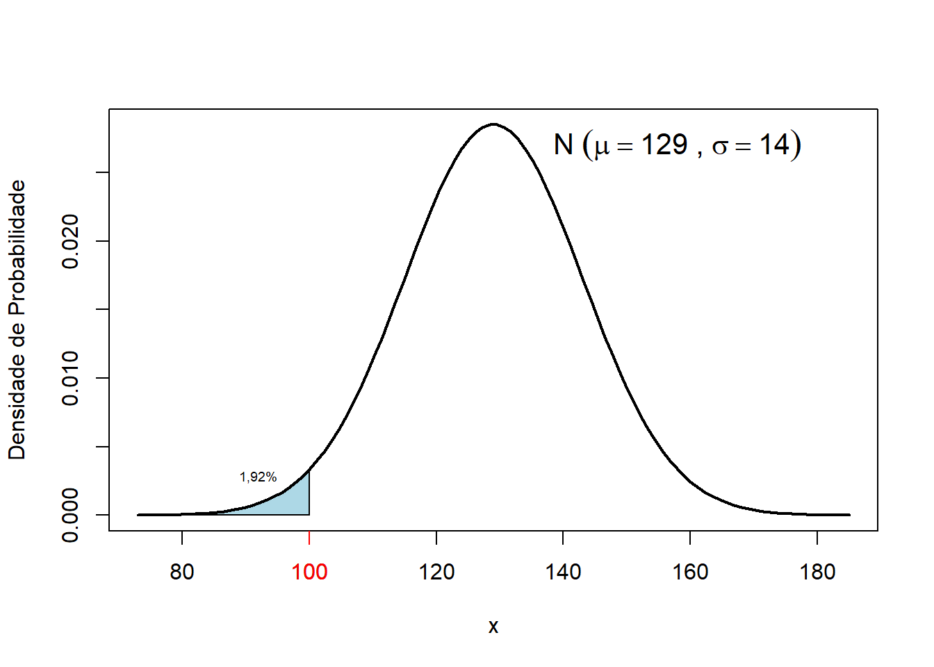 Para responder a essa pergunta, será usada a função pnorm() (veja Seção 9.7.2) que utiliza o escore Z, a média e o desvio padrão para encontrar essa proporção que, multiplicada por 100, fornece a percentagem.