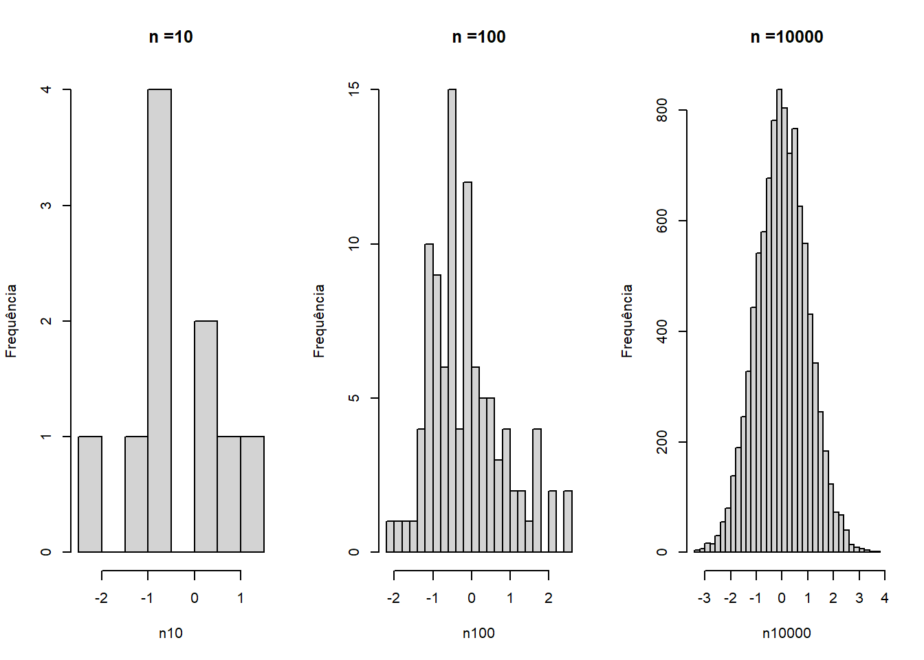 Quanto maior o número de variáveis aleatória criadas, mais próximo a média do número de sucessos estará do número esperado de sucessos que é igual ao número de sucessos vezes a probabilidade de sucesso em cada ensaio (5 x 0,50 = 2,5).