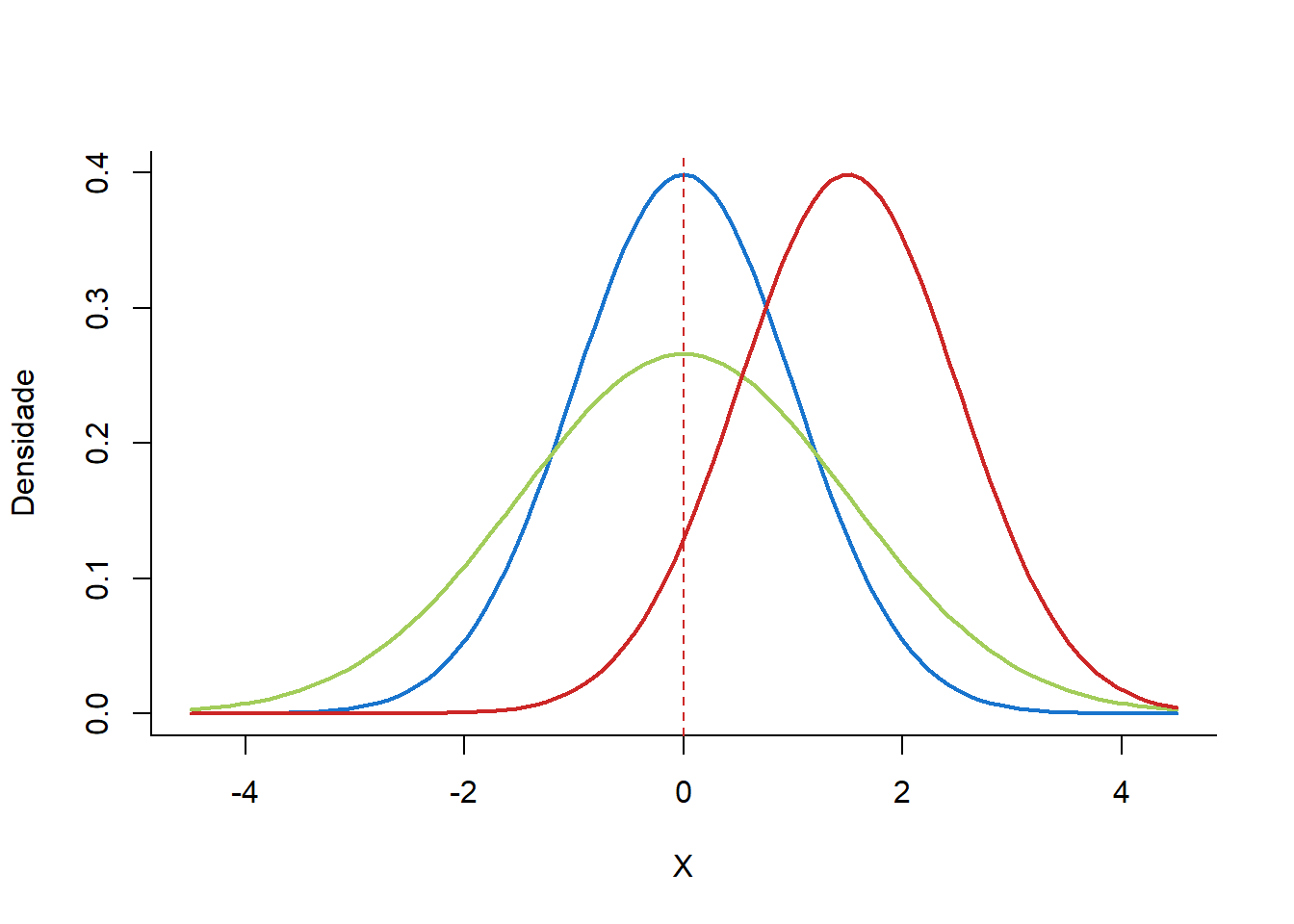 A Figura 9.5, mostra a distribuição normal com média 0 e desvio padrão 1, na curva à direita, a distribuição normal com média 1.5 e desvio padrão 1. Sobrepondo-se à curva da esquerda observa-se uma curva mais achatada (verde) que tem média 0 e desvio padrão 1.5. Observa-se, como mencionado, que modificando os parâmetros da curva, altera-se a posição ou o formato da mesma.