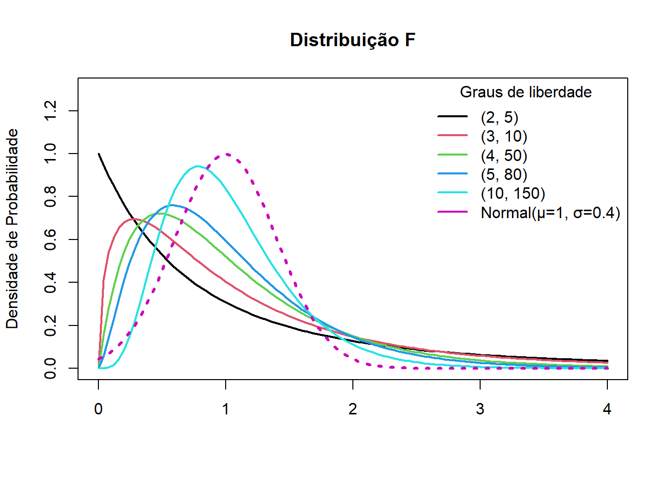 Assimetria positiva: A distribuição F é assimetrica à direita, ou seja, tem uma cauda longa para o lado positivo, mas a assimetria diminui à medida que o número de graus de liberdade aumenta, conforme observado na Figura 15.3.