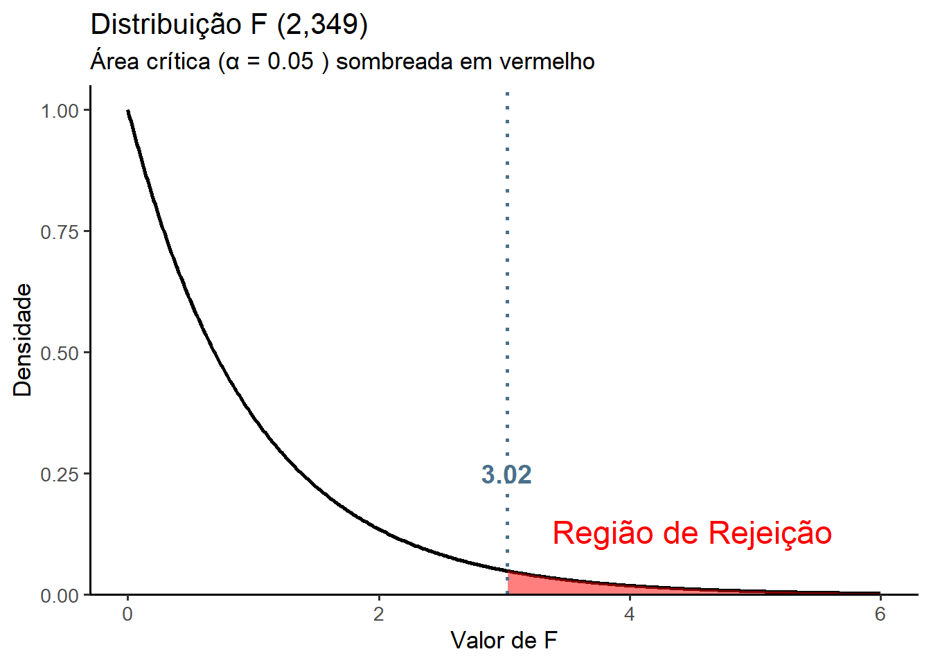q: O valor quantil para o qual se quer calcular a probabilidade acumulada;df1: são os graus de liberdade do numerador;df2; são os graus de liberdade do denominador;lower.tail = TRUE: (Padrão) Calcula a probabilidade da cauda inferior (\(P(F \le q)\)). UsarFALSEpara a cauda superior (\(P(F \gt q)\)), que é o que geralmente se busca em testes de hipótese.