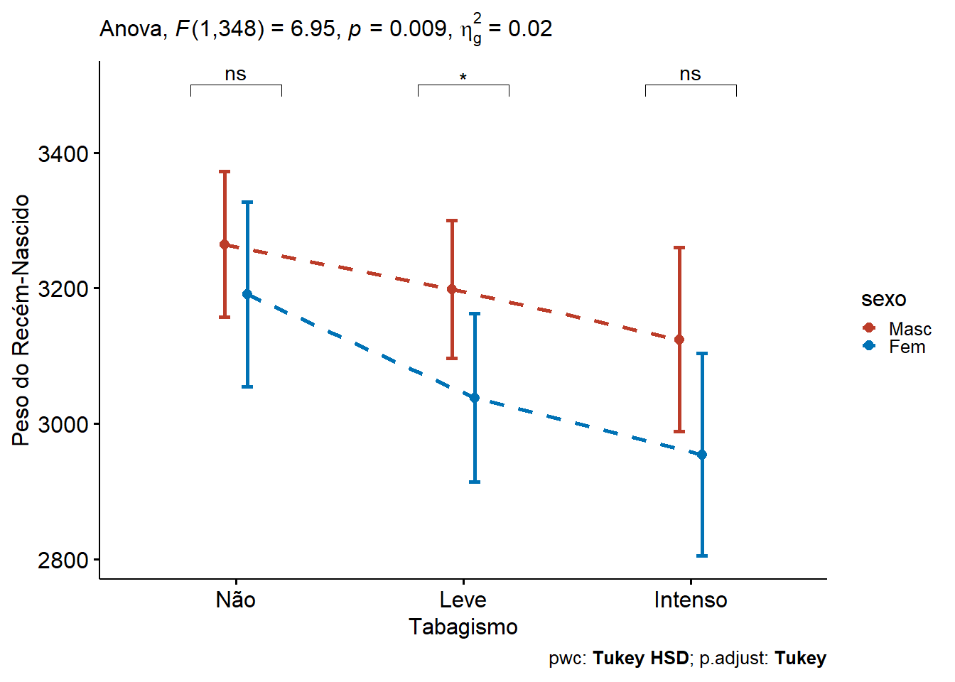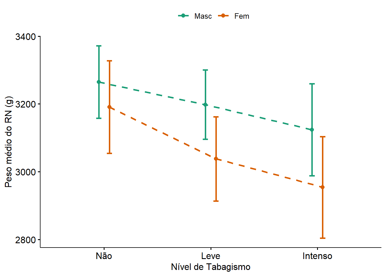 Os resultados indicam que tanto o sexo do recém-nascido quanto o nível de tabagismo materno influenciam significativamente o peso ao nascer. Observou-se:
