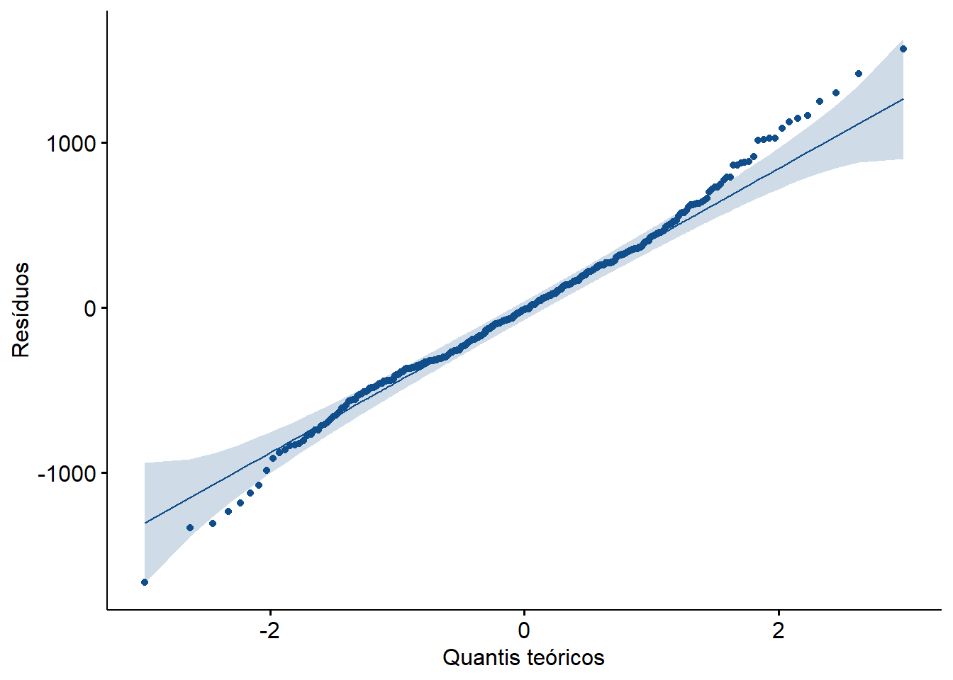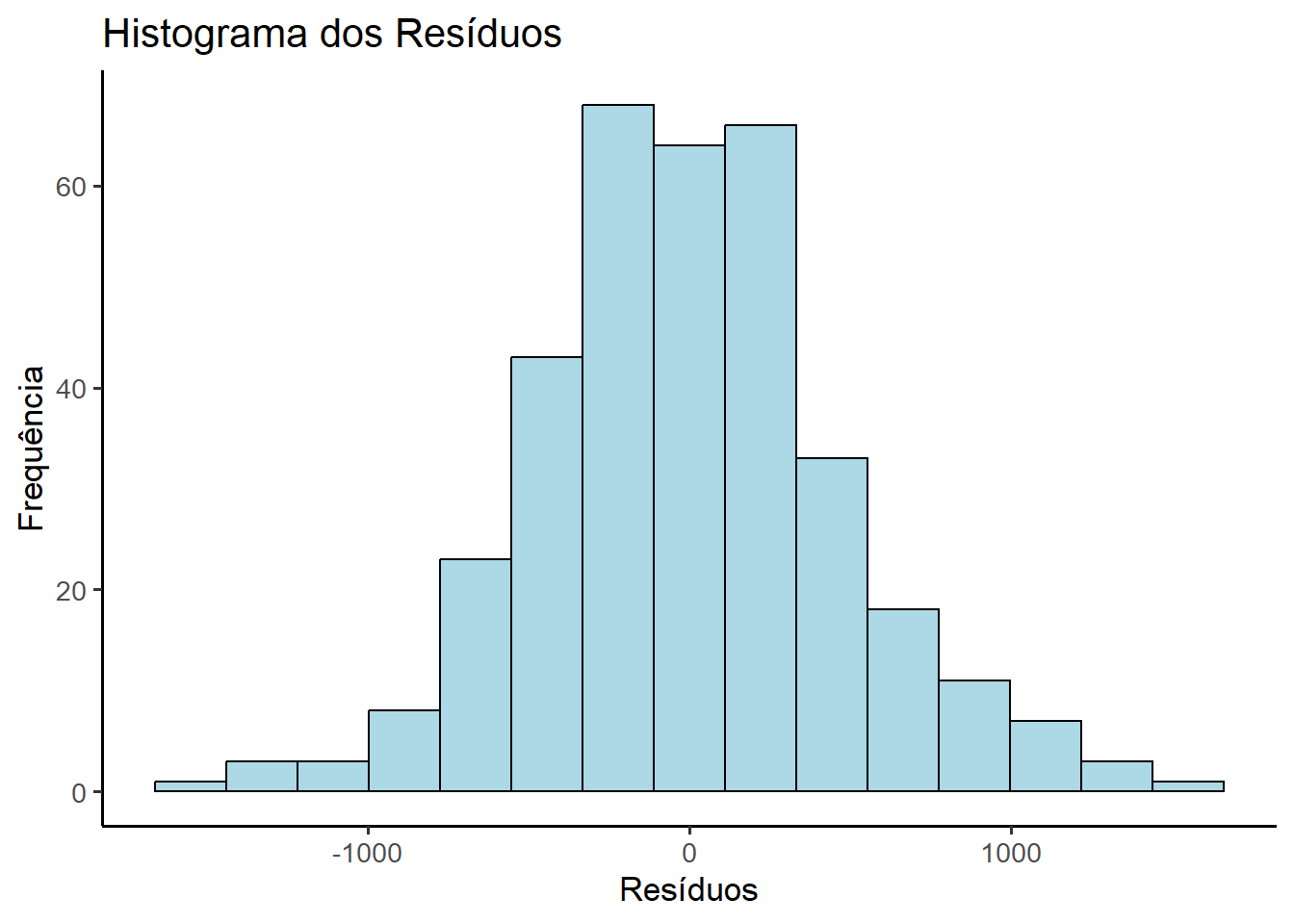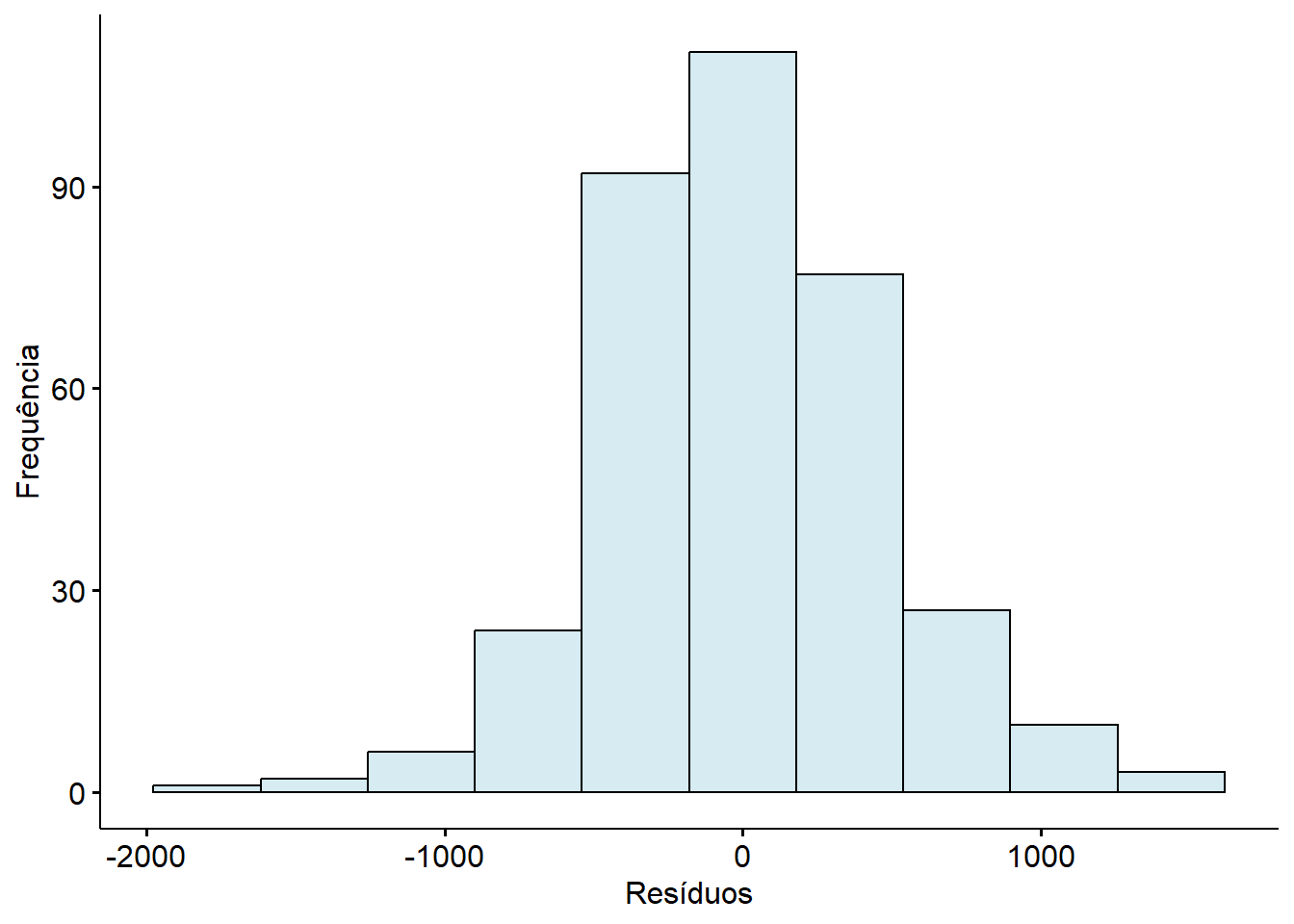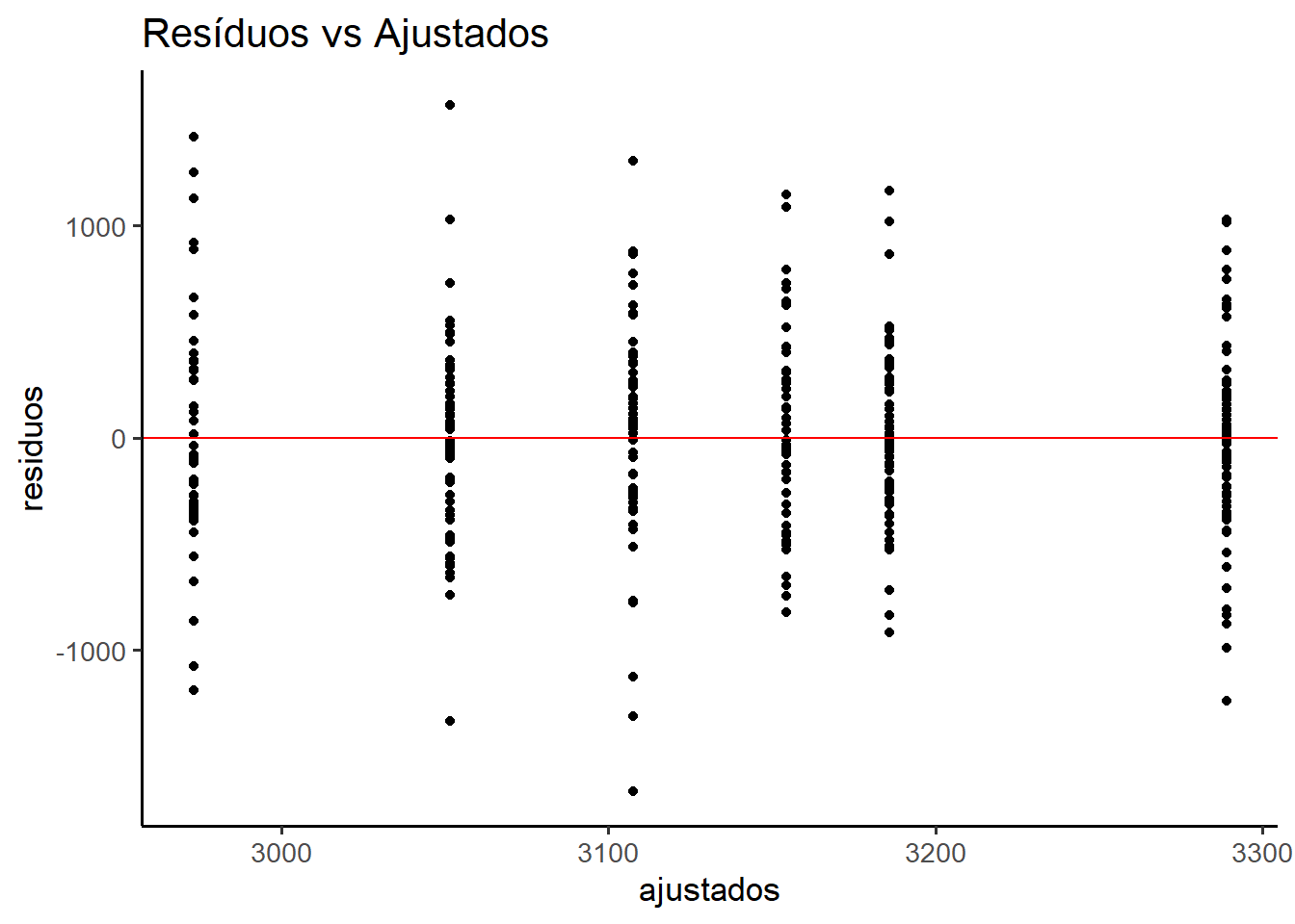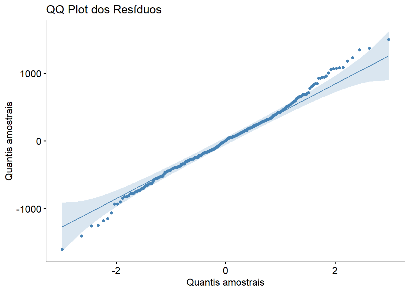 A igualdade das variâncias entre os grupos foi testada por meio do teste de Levene, utilizando a mediana como medida de centralidade. O resultado (p = 0,7696) não indicou diferenças estatisticamente significativas entre as variâncias, corroborando o pressuposto de homocedasticidade. Essa evidência foi reforçada pelo gráfico de resíduos versus valores ajustados, no qual a dispersão dos resíduos se apresentou constante, sem tendência ou padrão sistemático.