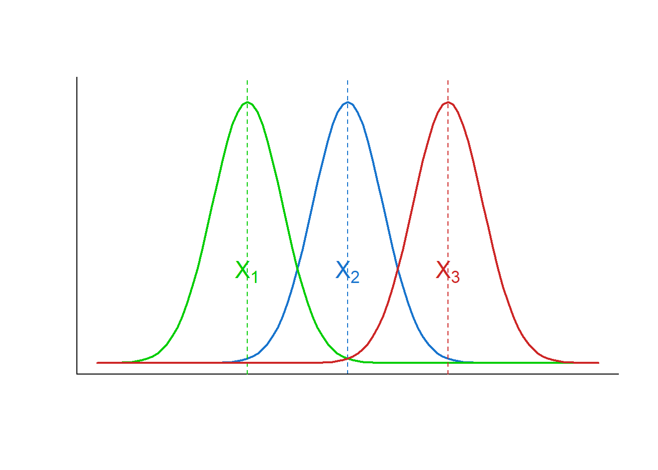 Considere a Figura 15.1, onde está representada a distribuição de uma variável X em três grupos independentes. Pode-se, claramente, distinguir observações provenientes dessas distribuições, pois a sobreposição delas é pequena. Cada uma dela se dispersa pouco em torno da média.