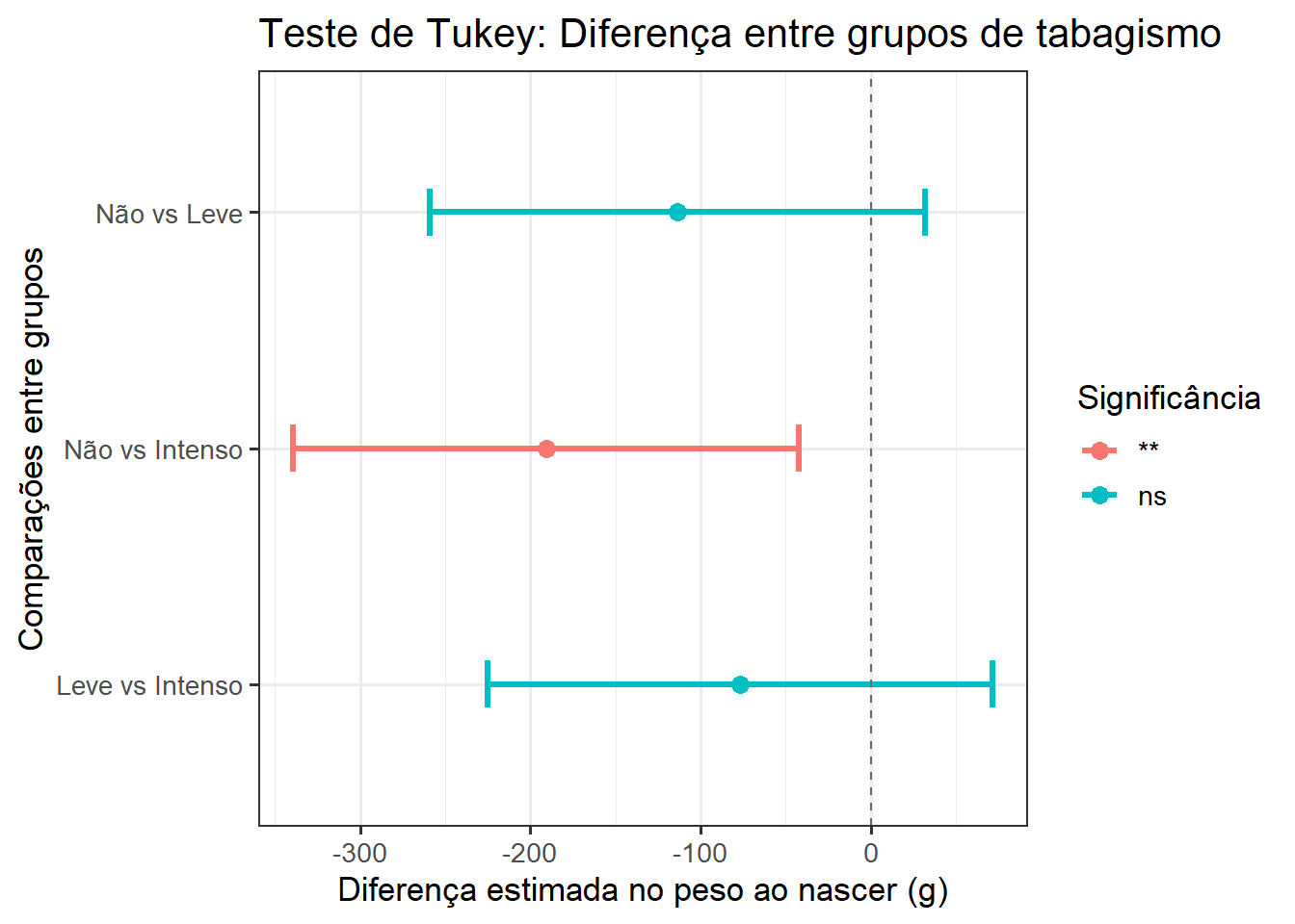 Existe uma diferença estatisticamente significativa no peso dos recém-nascidos entre os grupos “Não Fumante” e “Fumante Intenso”. A diferença estimada de perda de peso foi de -190,72 g (IC95%: -338,07; -43,37), p = 0,007. Os recém-nascidos de mães fumantes intensas apresentaram peso significativamente menor do que os de mães não fumantes.