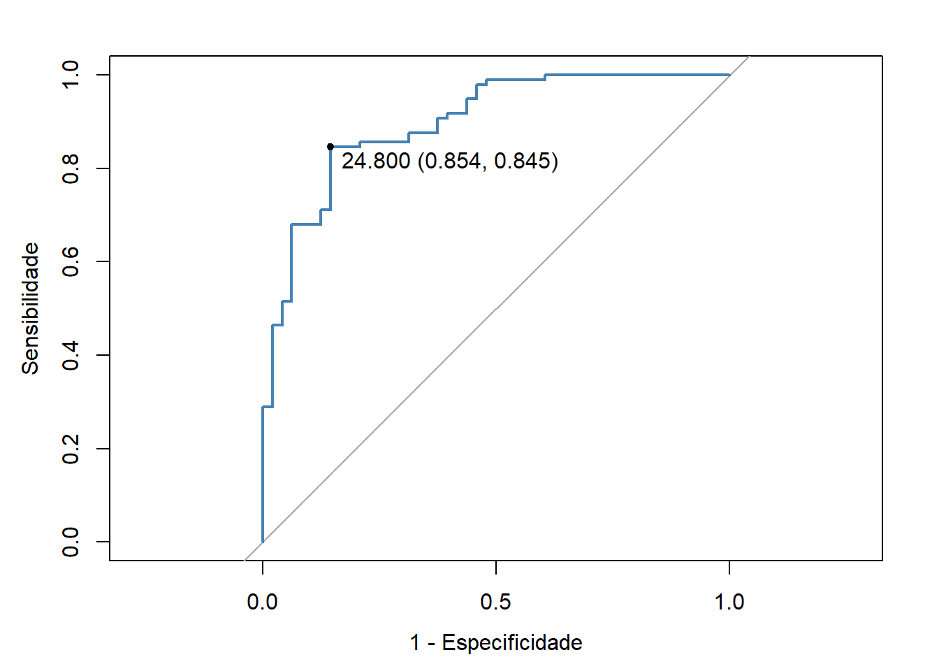 Assim, para o Teste 3, o ponto de corte ideal é 24,8, onde a especificidade é igual a 0,854 e a sensibilidade é igual 0,845. Estes dados, fornecem um LR para um resultado positivo igual a: